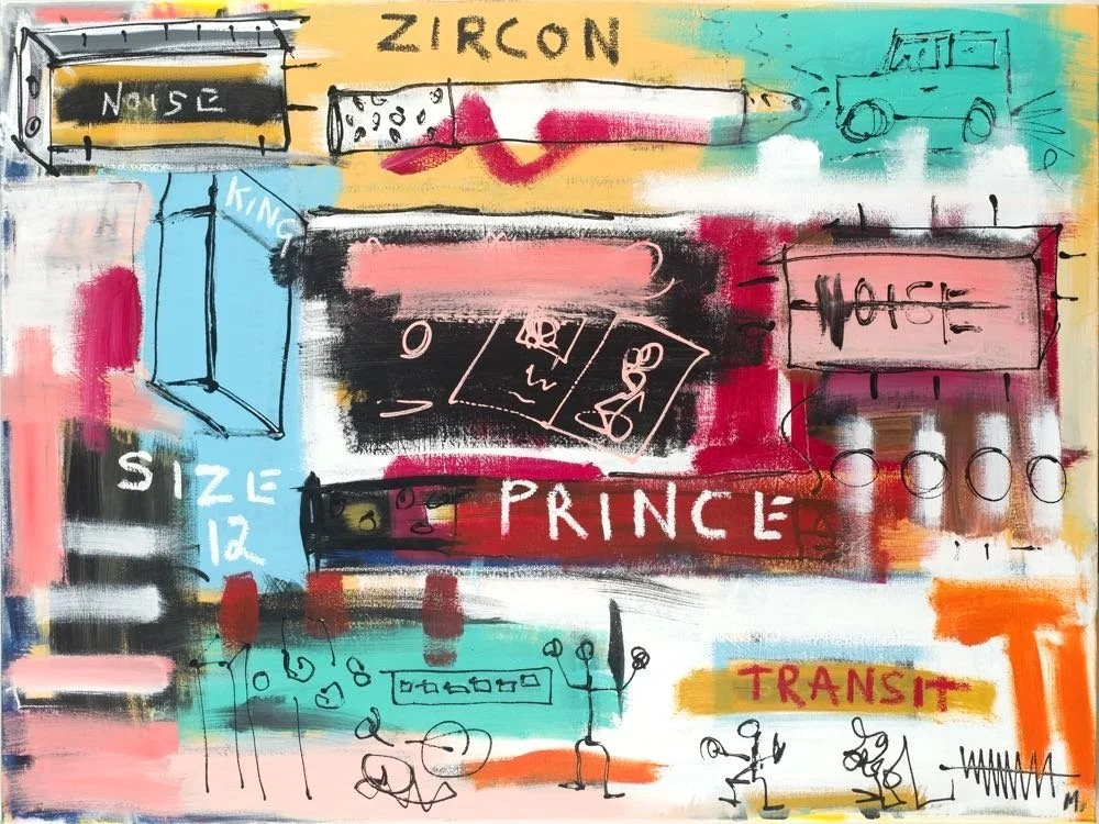 A vibrant collision of colour, symbols, and movement, Zircon Prince captures the feeling of being mid-journey—half in the physical world, half inside the mind. This piece channels the sensation of a road trip on the highways of the central nervous system—a restless voyage through memory, emotion and imagination.